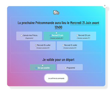 Visualiser en temps réel la ou les prochaines Pré-commandes.Recevez une alerte chaque Mercredi par SMS, EMAIL et Notification.